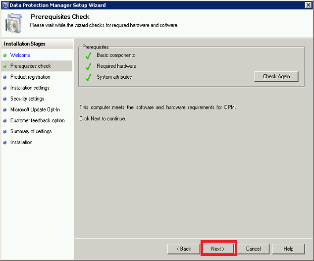 Once the server reboots, unfortunately the same above steps need to be followed once yet again to get to the prerequisite check screen. (Only if the Single Instance Storage wasn’t installed previously)