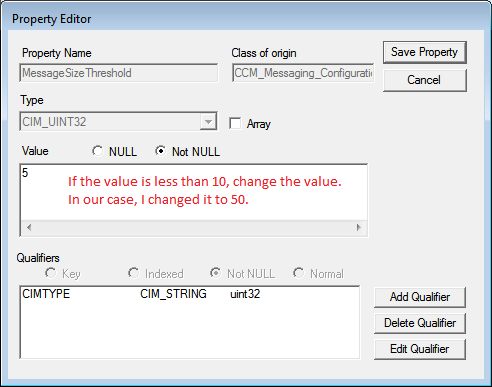 - In the Property Editor dialog box, change the value to 50 in the Value box, and then click Save Property.